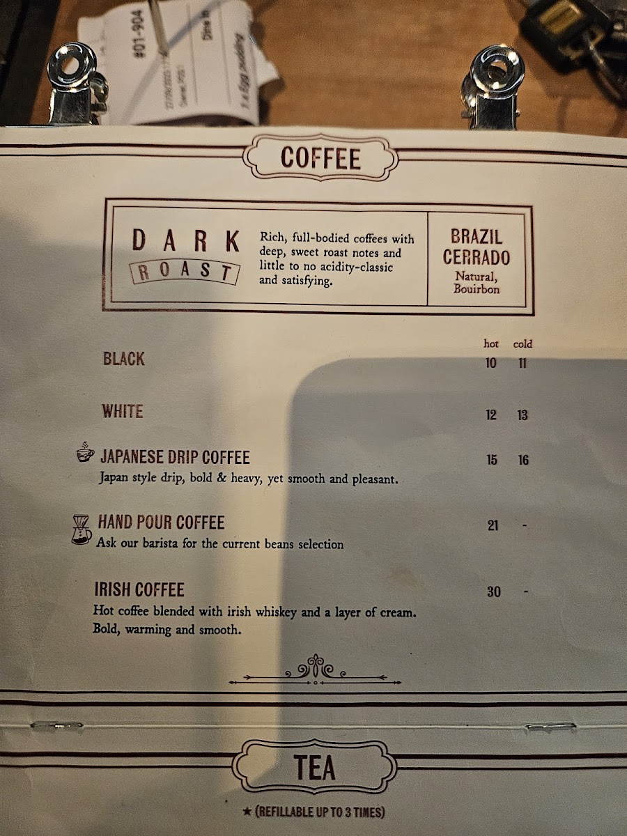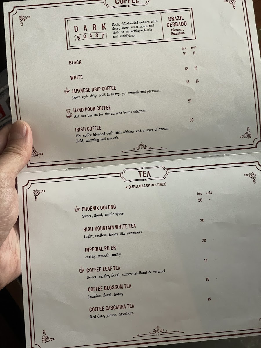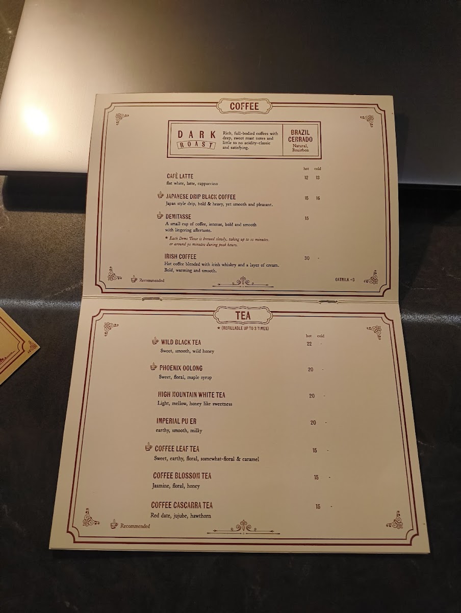 The menu is structured to support different visitor needs, whether for a quick order or a more relaxed, casual dining experience. Coffee selections include both classic and specialty brews, suitable for morning or afternoon consumption. Light food and dessert items provide additional options, making the menu appropriate for light meals and snack times.